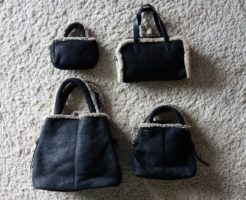 先日、ラムファーベストを着ていました時に持っていたムートンバック。 実は、同じ形で小さ目のモノやデザイン違いがあるのです。 使う用途によって、持つ大きさを変えて。。。 一番大きめのバック(左下)の中に入れ子・・・